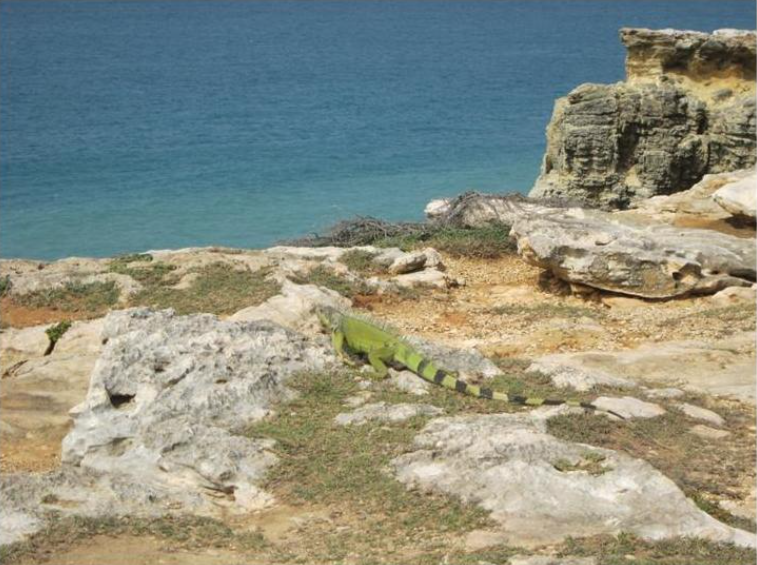 第七天往回走,我们时间充裕,悠哉游哉沿着海岸线走小路,来到岛的最西南角巴亚撒利那(Bahia Salina)。这是生产海盐的基地,没有什么旅游的人专门来玩,但是风景出奇美丽,真正的白色沙滩,蓝色的海水,还有一座报废的航标灯塔。站在海边是一只大鬣蜥,似乎不太乐意我们侵犯了它的领地。