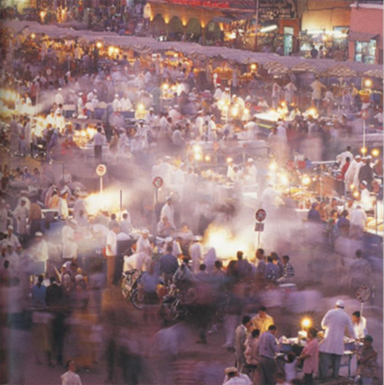 第二天离开卡萨布兰卡去马尔喀什(Marrakech)。我们开始上了高速公路,开了一阵觉得有点乏味,半途就从高速下来转一般公路。一出高速生活气息便扑面而来,每过一个镇子,都见路两边餐馆、水果摊、大车店熙熙攘攘。午餐我们就在路边的餐馆里解决了,吃的是塔近(Tajine)。这是摩洛哥传统菜,大块的胡萝卜,土豆和洋葱盖在肉上,放在一个彩色尖顶的陶器里在火上煮。肉可以是羊、牛、鸡,调料是橄榄、孜然、珈哩的味道,热呼呼地用大饼沾着吃。丫丫说她要当旅行者(Traveler),不做旅游人(Tourist)。丫丫在镇上单独行动,四处拍照,还到水果摊给我们买了几个新鲜甜蜜桔子回来。路过另一个集市我们又进去买了花生米、杏仁和一盘摩洛哥的音乐磁带,整个集市里大概就我们三个是外国人。