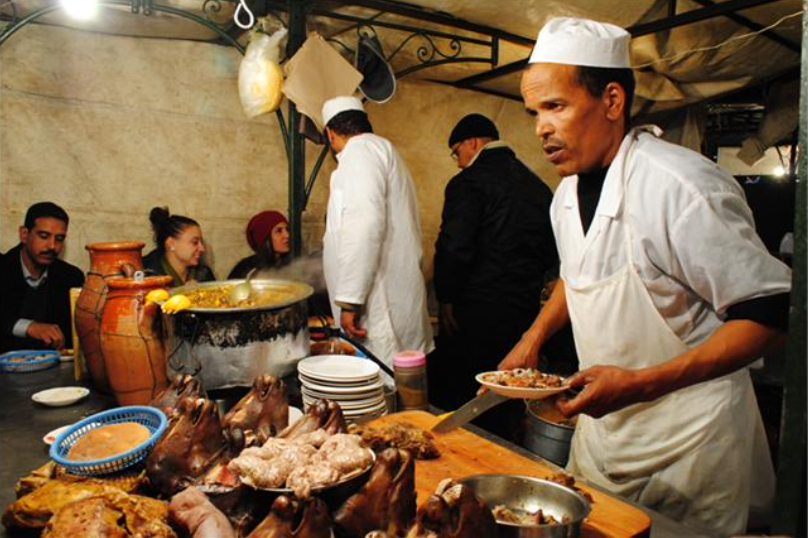 广场的面积和天安门广场差不多。摆摊的更是五花八门,有耍猴的、玩蛇的、算命的、还有讲故事的。属讲故事的围观的人最多。到晚上,广场瞬间灯火通明,排列整齐支起了棚子,摆满了桌椅,变成夜市。丫丫要求独立行动,我们给了她45分钟。她独个儿游转,自己还到卖汤的棚子喝了一碗素菜汤,花了三个德汉,她觉得有趣的是木头做的汤勺。梦华围着卖羊肉的棚区转了一圈,选吃客多的棚子坐下来。大师傅就站在面前又烧又做。他庖丁解羊头的技术像变戏法,一眨眼的功夫,肉和骨就分离了。案板上并排放满了羊头,锅里煮着嘟嘟冒泡的羊肉,吃客们围着三张长桌子和长条凳坐着。我们先要了一盘羊肉,用大饼沾着吃,后来看到旁边一个小伙子要的肉部位好,又要了一盘和他一样的。一盘只要二十五德汉。我们这位号称当时在吃素的老公盯着羊肉的眼神,就像狗儿子Bache盯着骨头似的。