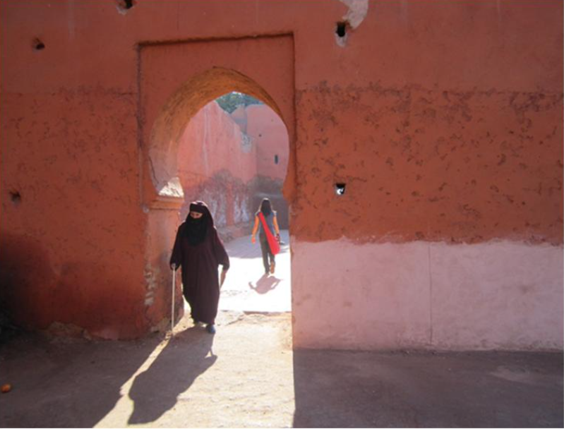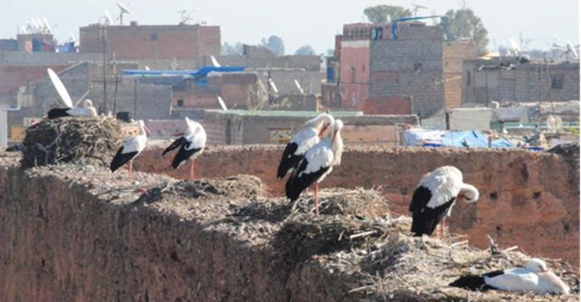 第三天我们继续在马尔喀什老城内参观,从巴蒂皇宫遗址开始。巴蒂皇宫是十五世纪修建的。当时的国王打败了葡萄牙,用葡萄牙的战俘换了许多钱,花二十五年时间才建成。现在的残垣断壁仍然能显示当年的辉煌。粉红色的宫墙,南北两座殿堂,中间池塘和花园,池塘里还有岛屿。院墙上有座角楼,可以登高远眺。有趣的是几百年后的今天,这座王朝的宫殿雀巢鹫据了。当地一种像鹭鸶的鸟叫鹳(Stork),在断墙上筑满了窝。这种鸟被当地人奉为圣鸟,说是人变的。看那窝里的一对雌雄鹳,可能就是五百年前的国王和王后呢。