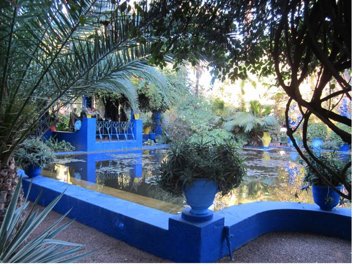 下午我们离开了老城,去参观一所花园。法国画家麻角热勒(Majorelle)1924年来马拉喀什治病,买下了这块地。受当地土著巴巴人民俗民风的影响,加上他本身画家的灵感,他把这块地建造成热带花园。除了各种热带珍奇花草树木、楼台亭阁、小桥流水以外,这座花园有别于其它的是色彩。他用了大量的墨水蓝漆涂在房上和亭台喷泉上,又用黄、粉、桔子色涂在路边巨大的花盆上,强烈的色彩对比产生震撼人心的效果。1947年他把自家花园对公众开放。十五年以后他死了,花园濒临荒芜。直到1980年,另外一个法国著名服装设计师(Yver Saint·Laurent)买下了这座花园,并设立基金会,保障了花园维护原样并继续对公众开放。服装设计师后来也死了,花园一角有块他的墓地。慕名来参观的人很多,门外服装店,家具店卖的衣服和器皿都是那种墨水蓝,人称麻角热勒蓝。正巧,我带来的头巾和裤子中也各有一条这种麻角热勒蓝的。