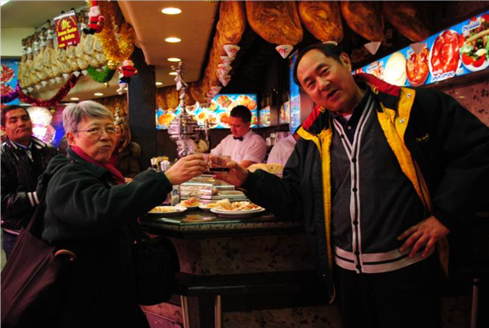 第八天早晨顺利地离开了摩洛哥,下午又来到马德里。我们有六个小时时间可以进城消磨。从机场乘地铁到市中心只要四十五分钟,地铁站和车厢也都更新换代了。圣诞节市中心的商店都关门了,只有饭馆和塔帕斯(Tapas)店还开。街上人很多,有音乐会和街头艺术表演。塔帕斯是西班牙特有的小吃店,有酒有菜,天花板上挂满了生火腿。我们上次来就喜欢上它了。店里没有桌椅板凳,顾客都站在柜台前,要的酒菜就摆在柜台上。顾客吃喝完就走,餐巾纸和烟头扔得满地,地面脏说明生意兴隆。我们要了酒和四个下酒菜外加面包,吃着喝着看着来往过客。有的人只要酒,有的人要一个小菜。在塔帕斯吃不算正餐,但是对我们来说已经足够了。出门时街上圣诞彩灯全亮了,丫丫买了一包热的糖炒栗子,这才有点过节的气氛。