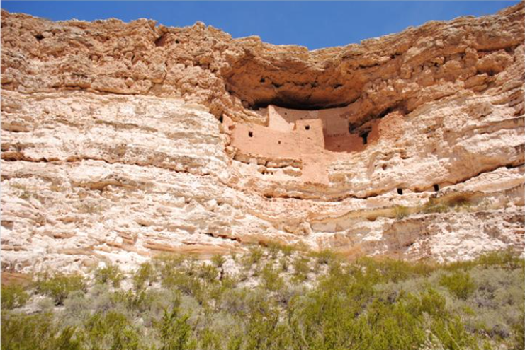 4月8日一早北上去大峡谷的前站法拉格斯塔夫(Flagstaff),路程是270英里,我们不用赶路,悠斋悠斋边走边游。穿过亚利桑那州首府凤凰城(Phoenix)往北一百多英里到达芒特族玛山洞城堡(Montezuma Castle)国家文物保护点。这是一条山谷,谷底流淌着一条清澈的小溪。一侧白色山崖峭壁的山洞里,保留了一组用石头和泥巴建筑的房屋,有二十间,五层,高于地面30多米,建造于公元1100年。这在美国就属于史前文化了。附近还有另一组房屋,有四十多间,有六层,建造在山崖底,损坏的比较厉害,只能看到一点屋墙的痕迹。据考察,公元700-900年时亚利桑那州的印地安部落就迁移到这个山谷里住了。附近有一眼泉水他们挖了井,有了水源,他们种玉米,豆类,瓜,还有棉花。已经有了用红土做陶器的技能。这个部落的人在这生活到1400年间,不知什么原因离开了,再也没有回来。被遗弃的房屋经过600多年风风雨雨能保存至今真不容易。