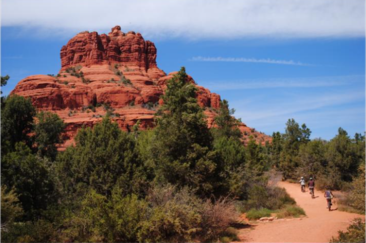 再往前我们从高速公路下来走小路去色豆那(Sedona),地势开始起伏不平,山脉的颜色变红,地貌开始向峡谷状转化。路旁设立了观景站不能不停,红山青松,让人耳目一新。一座山的形状像铃铛,旁边一座山四方块,见棱见角,都是红色的。我们停下来,丫丫和梦华去走了半个小时,梦华就叫膝盖疼了。