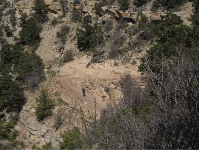 4月9日一早去大峡谷,七十多英里的路在爬坡,路旁的树林渐渐稀疏了,树干也变矮了,进大峡谷南门的旅游接待中心时,正赶上一群鹿也从门前路过,还相互谦让了一下。大峡谷公园内公共交通极其方便,三条路分别由红、蓝、橙三种颜色的汽车来回行使,每个景点都有站,随时可上下,十五分钟一趟车。丫丫要走不要乘车。我们和她共同选了一条人多的路,给她三个小时,手机随时联系。走小路下峡谷的路非常多而且长,很多人背着行李在底下露营。送丫丫下去后我们碰到一对年轻人刚上来,马上就让人帮他们在路标旁照相,说在下面走了十天,78英里。我们心里佩服之余暗自寻思,这样锻炼怎么一点都没瘦呀。我们有自知之明乘车观景就知足了。三条路近二十个景点我们一个个看个够。