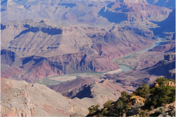 峡谷底部卡罗拉多河蜿蜒曲折,像条绿色的带子。就是这条看似温柔的带子,把原本厚实的卡罗拉多高原切割成千山万壑。这一过程用了六百万年。峡谷不同颜色的层层岩石,就像记载时代变迁的书,最早可以追溯到2亿年前。一百多年前1903年,美国总统小罗斯福(Theodore Roosevelt)看了大峡谷以后就说“这个壮观应该让每个美国人都能看到。”于是1908年立法保护,1919年建立了公园。