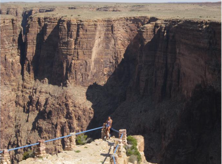 4月10日早晨去看最东边的景点。这里有一个早年印第安人建造的塔可以爬上去居高远眺。离开大峡谷后继续向东行,高速公路旁虽然没有上千米的大峡谷,但几百米的小峡谷却很多。只要有人在那摆摊卖纪念品,往里走走肯定有峡谷。我们看了一个以后再也无心恋战,要赶两百英里去参观印第安保留地。