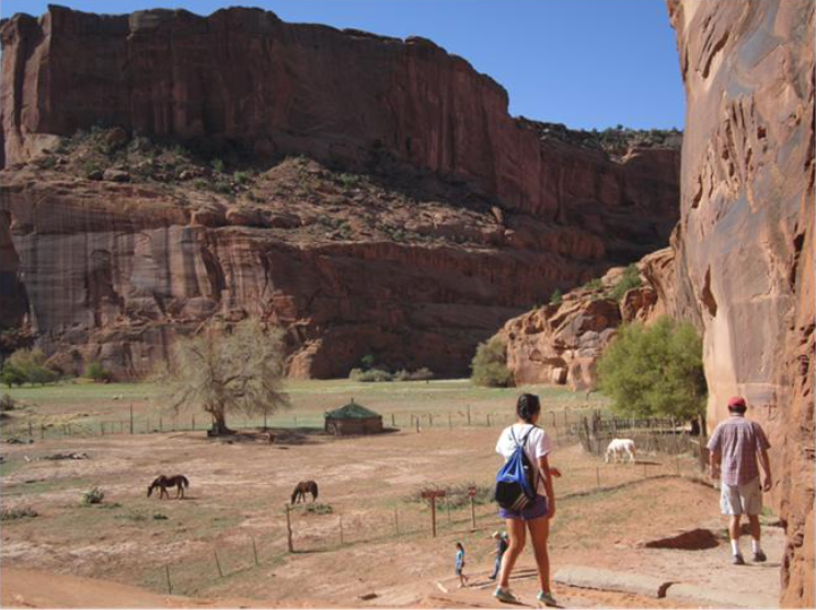 又开了一百多英里到达帝彻峡谷(Canyon de Chelly)。旅馆离峡谷只有几分钟的路,我们一住下就去看日落。这里的峡谷比起大峡谷高度和深度都属于儿孙辈的,最深的约300米,谷口只有10米深,越野车可以直接开下去。但因为都是当地人的财产,除了公园圈出来的地界,旅游者没有当地人带领不能随便走。谷底有一条小溪可以过车,谷底平地种着庄稼,放牧羊、马,还住人。住在谷底的生活一定像世外桃源似的。