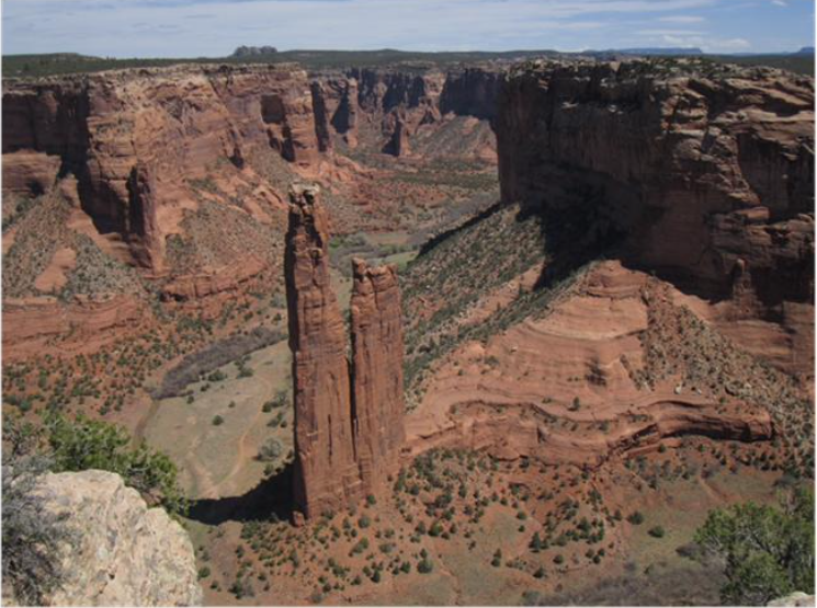 4月11日我们还是按大峡谷的规则,把帝彻的所有景点都拜访到。其中一个可以走下去的,走到谷底,近距离观看160米高的悬崖山洞里印第安人栖身的房子。这条路相对比较容易走,我们眼见一个小伙子从底下马不停蹄地跑上来,另一个爸爸肩上扛着孩子走上走下。但我们还是走了约两小时。峡谷中间有两条并列的石柱,245米高,叫蜘蛛石,是印第安人朝拜的圣石。据说是最早教人织布的妇女变的。