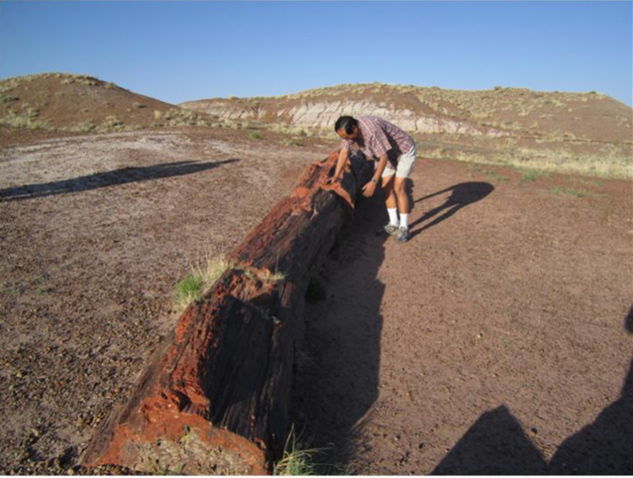 离开保留地后不知道是风渐渐地小了,还是地质渐渐地好了,路旁有农作物和人家了。我们赶在关门之前进了国家化石林公园(Petrified Forest)。这是一个有5万多公顷面积的平原,一条45公里长的公路带你去9个景点,里面没有鸟语花香和楼台亭阁,只有突兀的山包和裸露的岩石。但这是一本地球演变进化的教科书。大约2亿2千5百万年前,这块地是树木参天的热带雨林,并且有恐龙出没。后来洪水泛滥,冲倒了树木,水混合着泥沙火山灰掩埋了树木和动物,沉睡在海底变成化石。再后来地壳运动有的地方上升(黄石公园),有的地方龟裂(大峡谷),沧海变桑田,这里的水流尽了,化石就呈现在风化的沙土中。公园到处都是已经变成彩色石头的大树干。山包上不同的颜色和层次如同树木的年轮,标志着矿藏和年代。自从1932年建立公园以后,这里吸引了全世界的地质考古学家来考察。