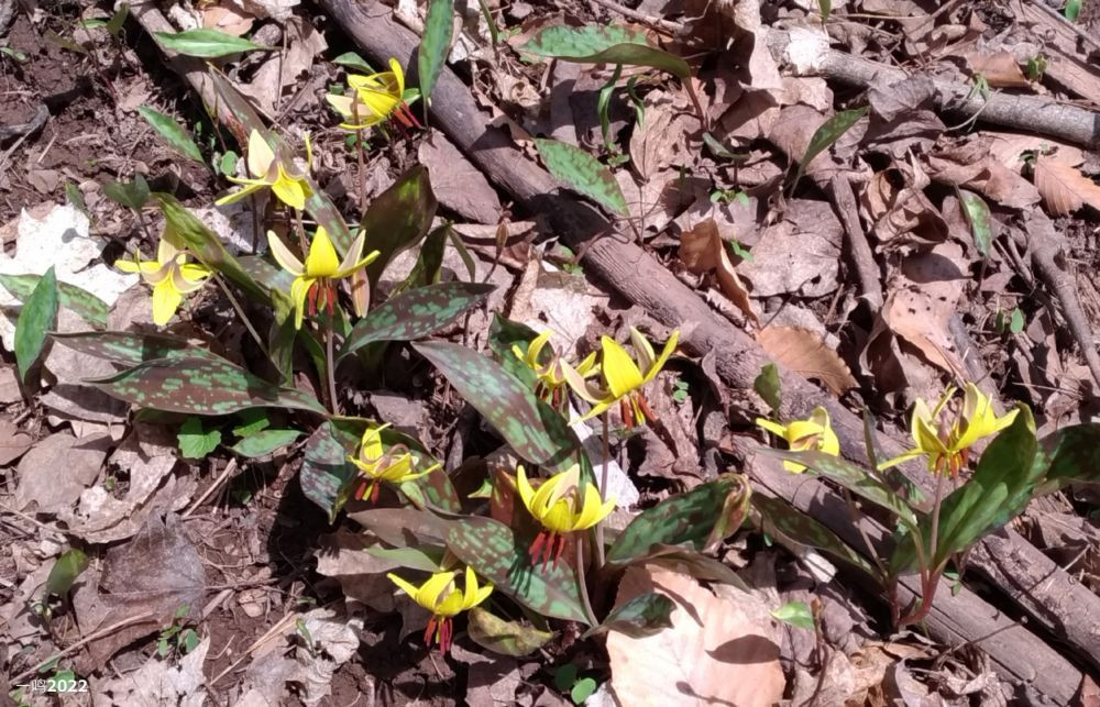 林中南径向阳暖, 春令野花争早倩。 点点黄星烁落枝, 朦朦大地睁迷眼。