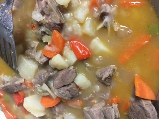 上个星期买了两只羊腱今天晚上解冻过水后放铸铁锅加入一点醋炖到羊肉可以咬得动,另外起锅放入一点植物油,把切碎的小尖椒和花椒放入爆香,然后把羊肉和汤一起到入锅中,翻炒几下,放入盐,红糖,生抽,大葱调味出锅。