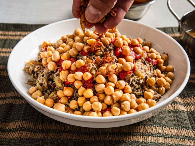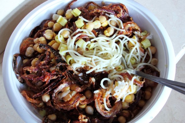 埃及最具代表性的国民美食,由米饭、通心粉、扁豆、鹰嘴豆混合,再淋上番茄酱、蒜醋汁和炸洋葱。