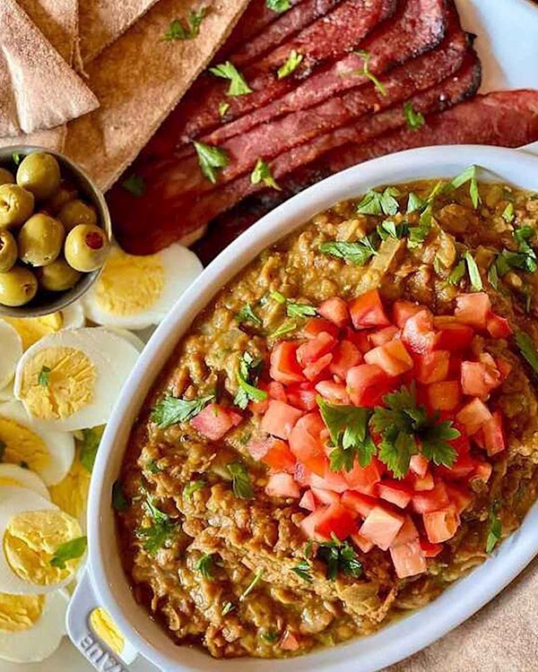 用慢炖蚕豆制成,加入橄榄油、柠檬汁、蒜和香料。