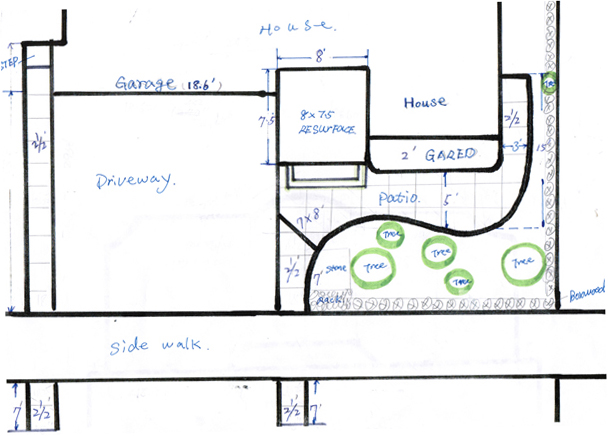一晃三年过去了,我的前花园工程还没有全面完工,一是人行道外侧的草坪,二是左侧邻居之间的共用草皮。去年征得邻居的同意(邻居的原话是 “you can do whatever you want, because I trust your taste”),开始设计两家之间、只有六英尺宽的共用草皮。由于草皮之间我已经做了十八英寸的压花水泥,所以我把这块地一分为三:中间种树,邻居那边,我选择了鹅卵石铺设、以和我们的压花水泥对称,并与主花园相配,另外如果日后邻居要做前园的工程,鹅卵石容易拆除、不会浪费太多的金钱。由于中间带很窄,所以在选择树种的时候,颇费了一点周折,最后选了一种叫slender silhouette sweet gum(我叫它修长香枫)的树,这种树的特点是树型非常窄、高,适合很窄的border、小型花园,或者是花园中的focus point。这种树一般是绿颜色,到了秋天树叶会变成橘黄色,秋末变深红色,而且有很少的果实坠落,成长快、耐寒,适合zones 5-8 (多伦多是zones 6 )。最重要的一点,树根往下长,树根不是很多,即使长大成材也不会影响水泥地面(有时看到水泥地面崩裂,主要原因是树根太密、上浮所致)。