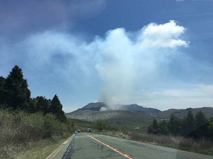然后又去阿蘇火山口,和樱岛火山一样是日本四大活火山之一。火山活动仍在继续,随着山头的接近,硫磺的味道渐渐刺鼻。在离火山口1公里的地方被禁止入内的标志挡住,有点儿遗憾。