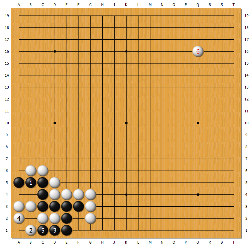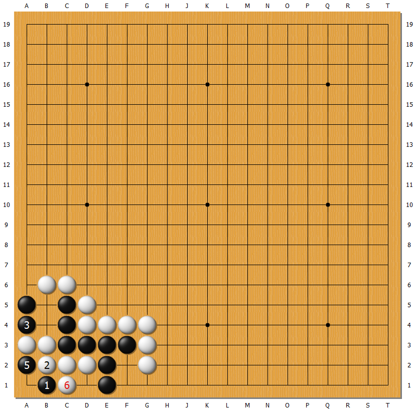 失败图1 黑1直接切断杀棋。白2虎,黑3挤,黑5破眼。白6冲一手。