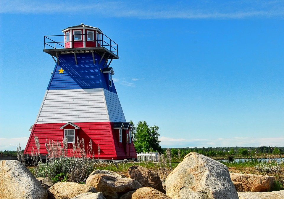 在132号公路的一个出口,我们偶然进入阿卡迪亚人聚居村。村里所有电线杆及每家门前旗杆都是法国三色旗,只是在左上角多了一颗金色的星,这就是阿卡迪亚(Acadia)人的标志。海洋三省、盖斯比半岛及美国缅因州南部,在早期殖民地时代,原为法国领土。17至18世纪英法争夺这片土地,以法国失败告终。当地法裔居民大多被驱除,少数人躲进深山,一部分南下美国,最南的走到了路易斯安那。