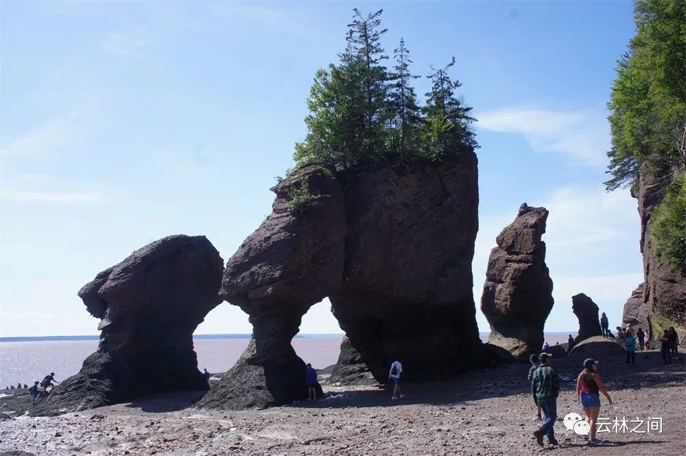 芬迪湾潮水涨落每天循环两次,涨落潮间隔6小时25分,每天涨落潮周期向后延52分钟。网上有每天的涨落潮时刻表,但到了好望岩石公园门口才发现网上时刻表不够准确。我们去的那天最低潮是上午10点多,最高潮是下午5点多,潮差约7米。