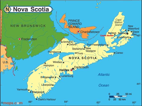 新斯科舍省悉尼市东南30多公里处的路易斯堡,曾经是北美最大的军事城堡之一。18世纪由法国殖民者兴建,作为扼守圣劳伦斯湾渔区的不冻港,1752年居民人数达4174。1745年第一次被英国海陆联军攻陷,1748年根据英法协议归还法国。之后,英国人就在哈利法克斯建立了大西洋最大的海军基地和城堡,依此和法国人对峙。1758年城堡再次被英国人攻陷,并以此为基地攻占了魁北克,1760年城堡被英国人摧毁。