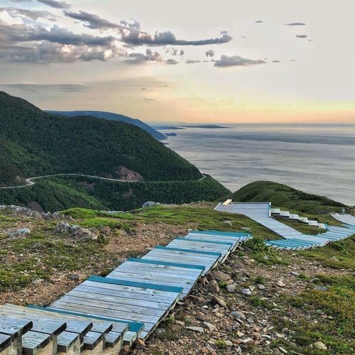 这条通往天空的步道就在Cabot公路的沿线,只有五英里长,传说是印第安人的通灵之路。站在山巅,可以俯视圣劳伦斯海湾的壮丽风光和曲折有致的一线海岸,运气好的话,甚至能在眺望之际,一睹大西洋鲸鱼的惊鸿一瞥!而我们,就在这条步道的下方路边观景点,看到了较低海拔高度的相同景致。