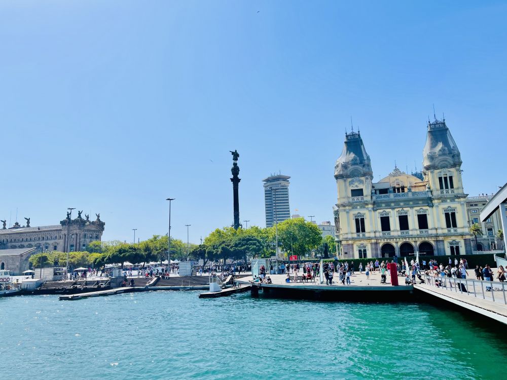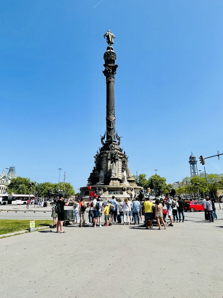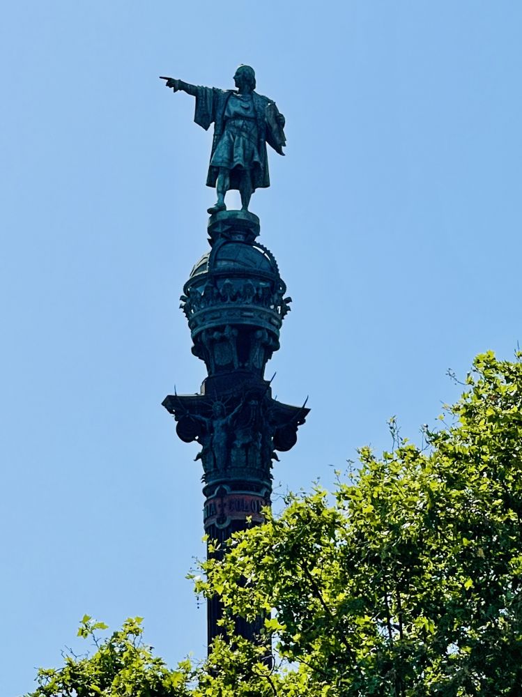 沿着兰布拉大街往前走,在步行街的尽头,在碧波荡漾的蓝色地中海边上,耸立着高高的哥伦布纪念碑,1493年哥伦布第一次航海归来,天主教双王伊莎贝拉和费迪兰在巴塞罗那欢迎他的凯旋。50米高的园柱形纪念碑顶端是哥伦布一手捧书、一手指着美洲大陆的方向的雕塑,这个纪念碑如今已成为了巴塞罗那港的重要标志。