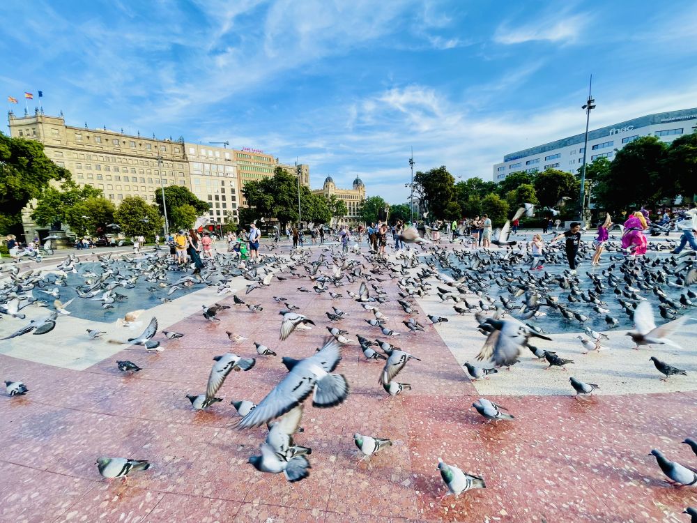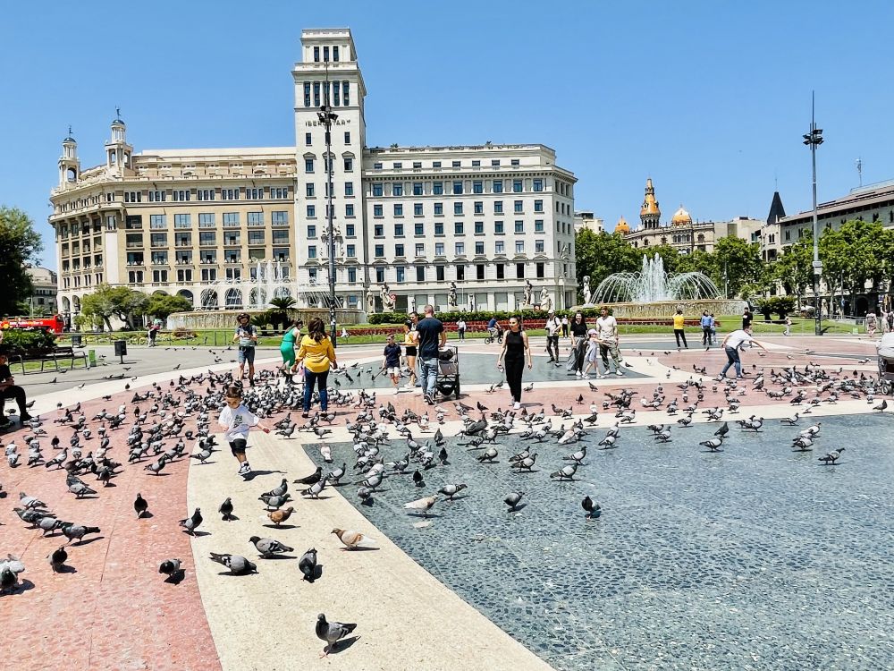 加泰罗尼亚广场上成群的鸽子, 一个个肥头大脑,同时起飞同时降落,仿佛这个地方只属于它们,给我们带来了一场群鸽舞曲。