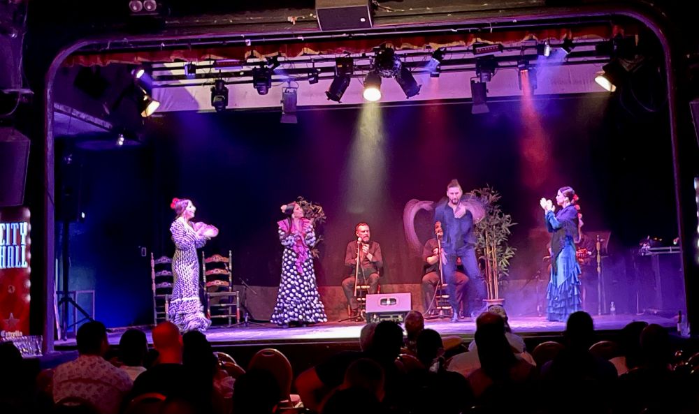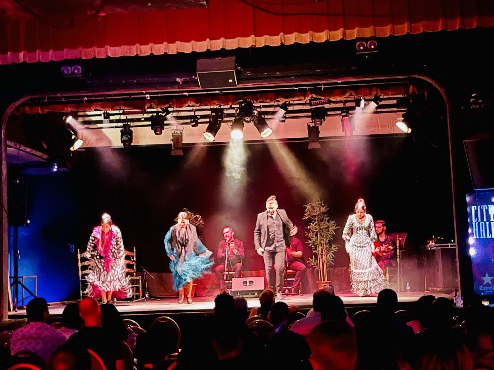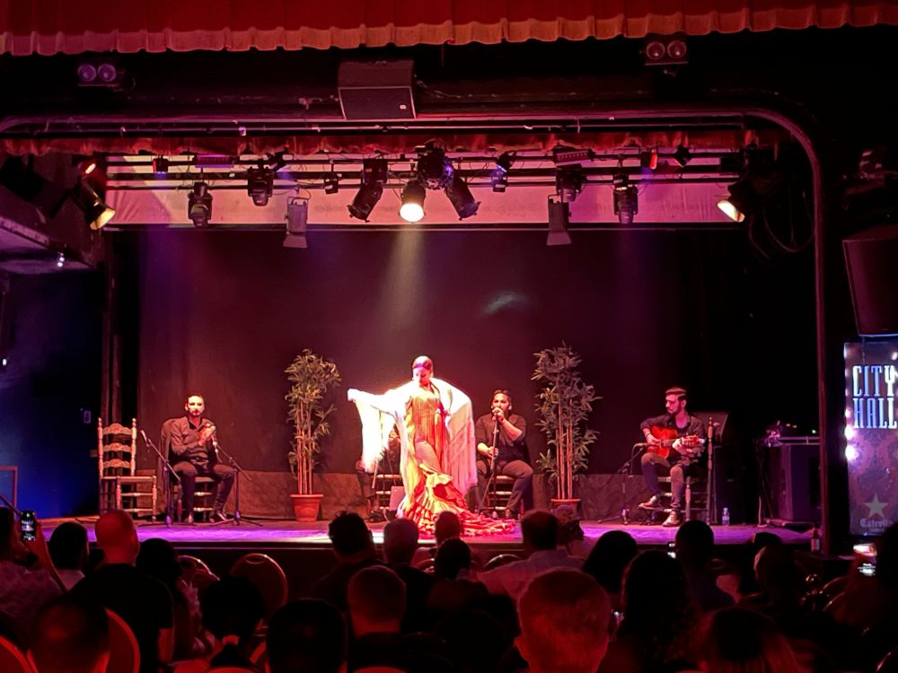 我们于黄昏时分来到Theatre city hall Barcelona 的演出厅,随着观众的陆续到来,灯光开始变得昏暗,在不知不觉中,舞台上巳经坐上了一个吉他手、二个歌者,吉他声响起,伴随着高亢的男声,弗拉明戈舞娘身着色彩艳丽的大摆长裙,手持响板,款款而来。