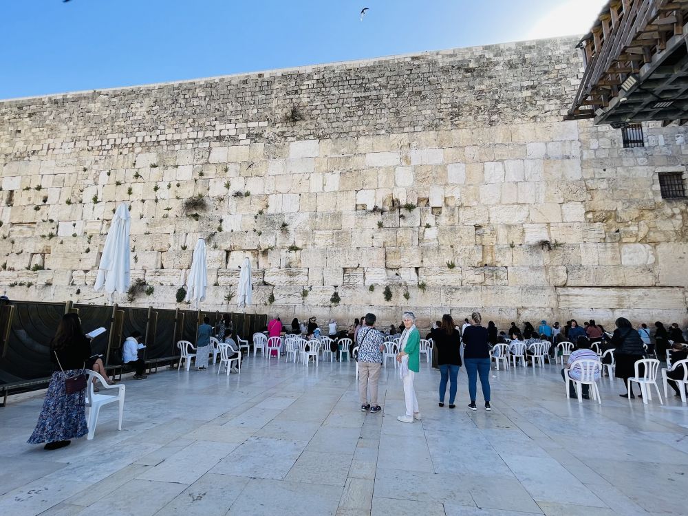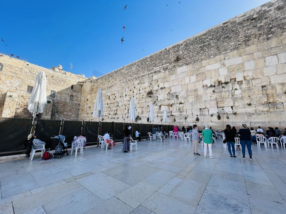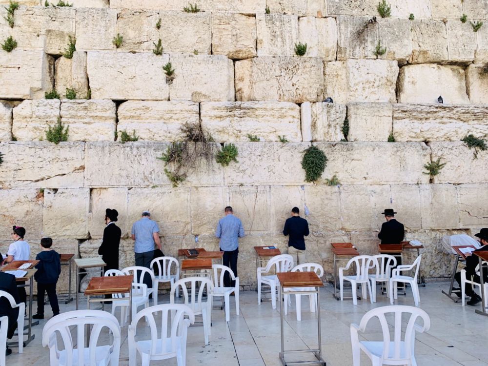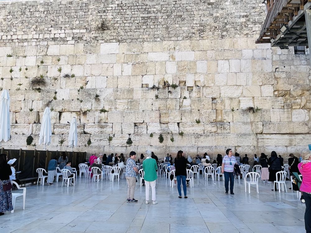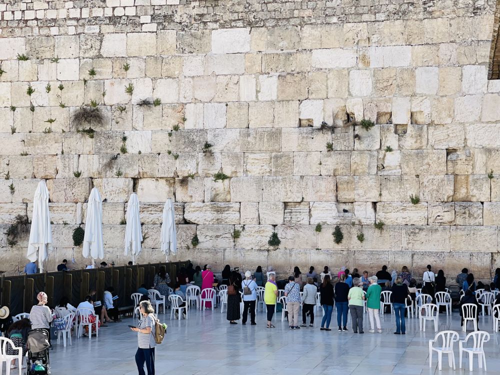 西墙广场上放满了祈祷用的桌椅,还有一些简易的柜子,上面散落着很多希伯来文撰写的书籍,供信徒阅读研习和祷告使用。