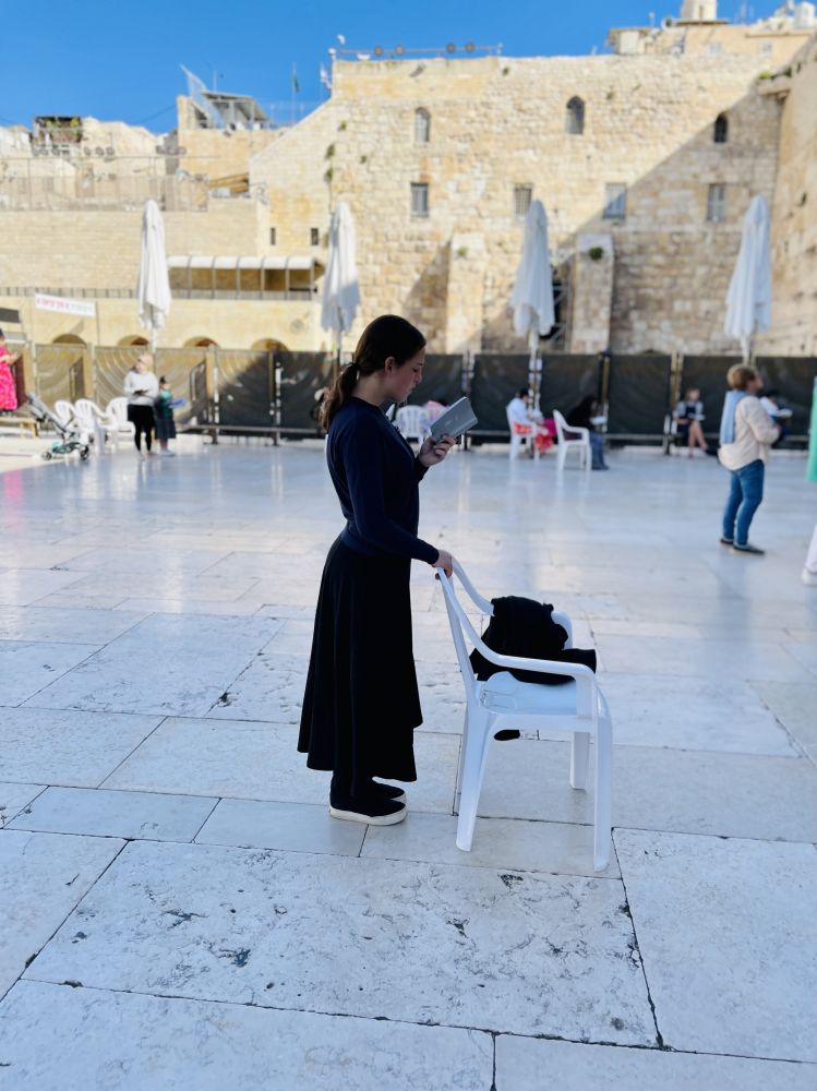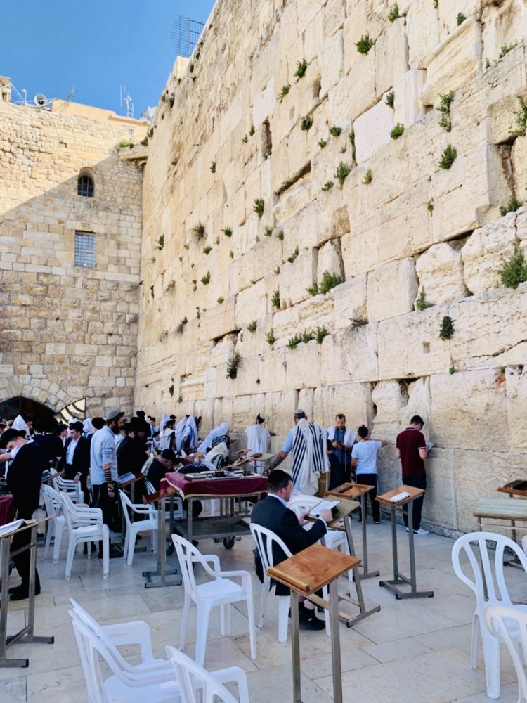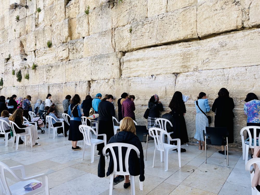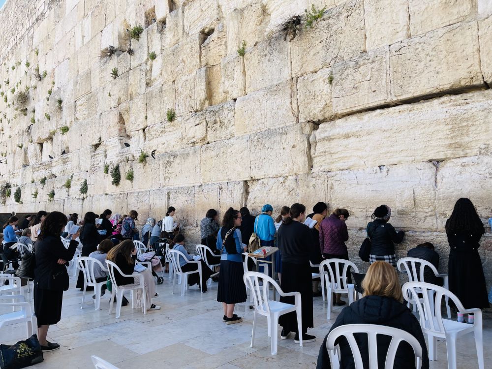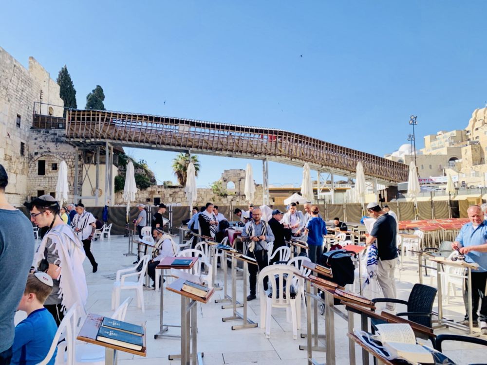 西墙广场上放满了祈祷用的桌椅,还有一些简易的柜子,上面散落着很多希伯来文撰写的书籍,供信徒阅读研习和祷告使用。