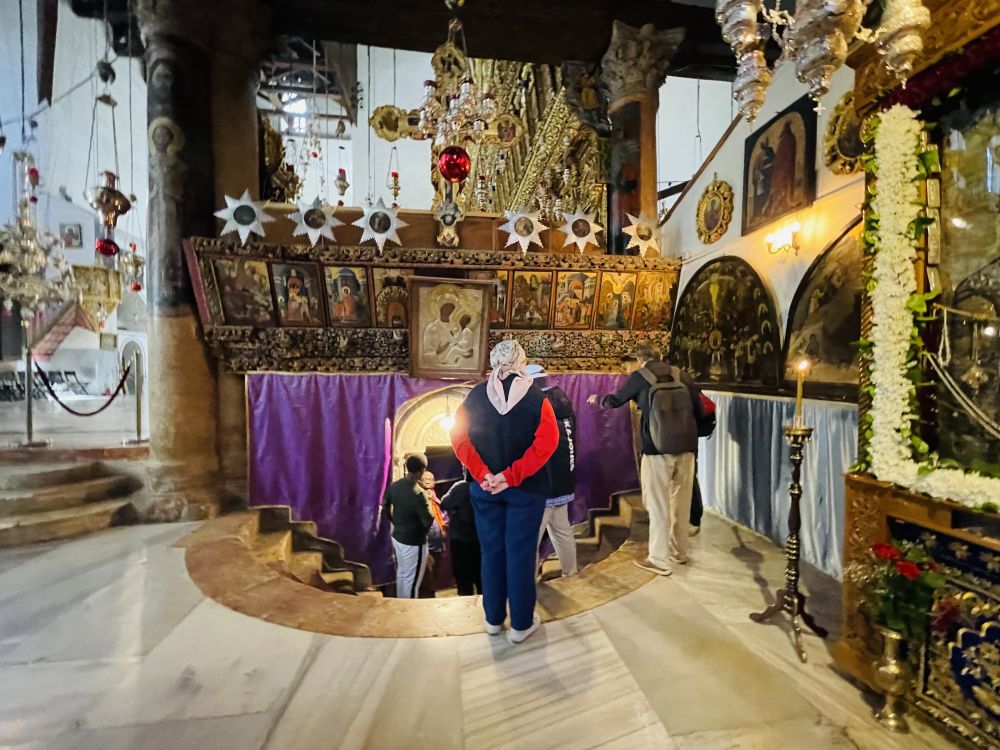 依次来到一个小祭坛前,在它的下方云石地面上嵌着一颗14角银星,这象征着举世闻名的伯利恒之星,石台上用拉丁文刻着“这是圣母玛利亚诞下耶酥基督之地”。信徒们跪下来,亲吻地板,抚摸了这颗星。