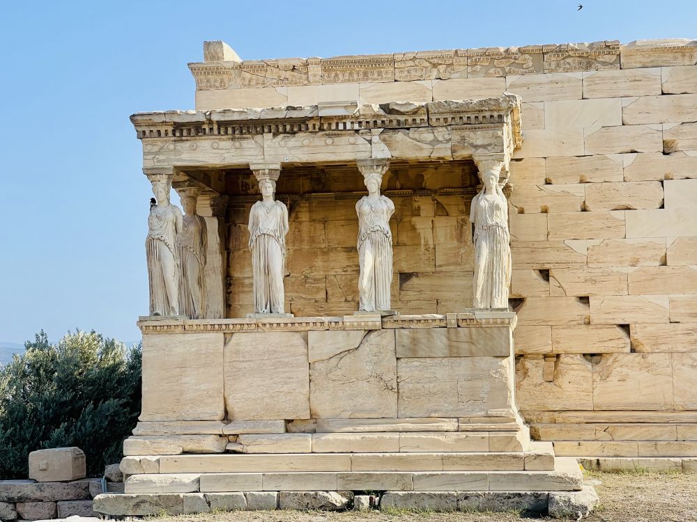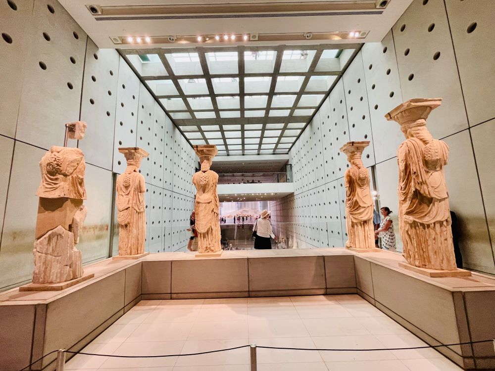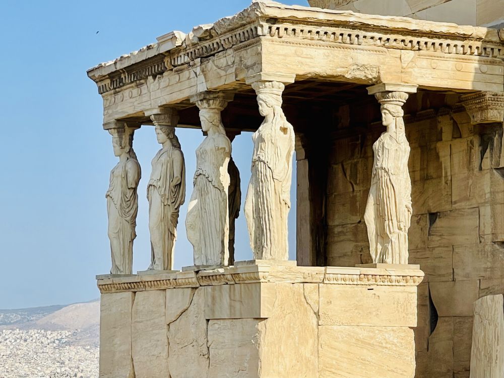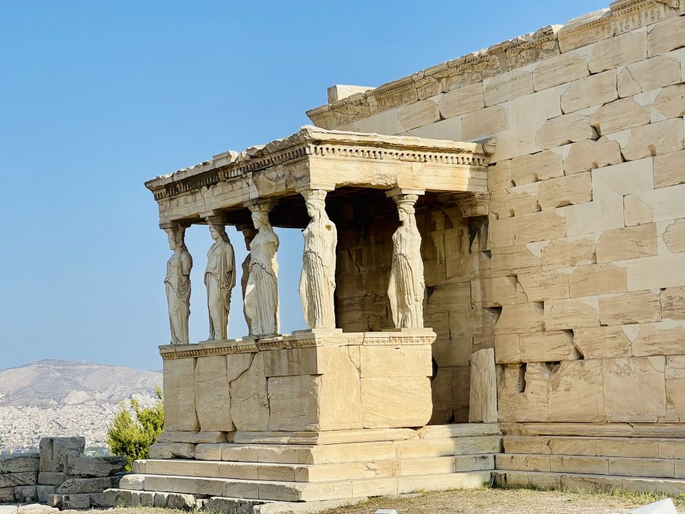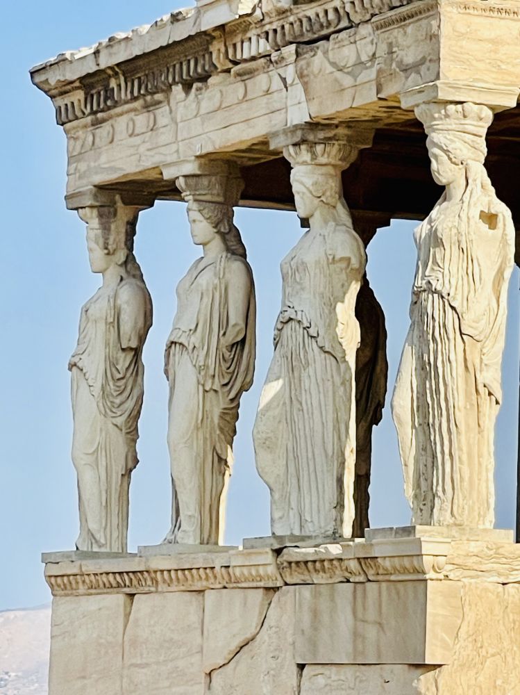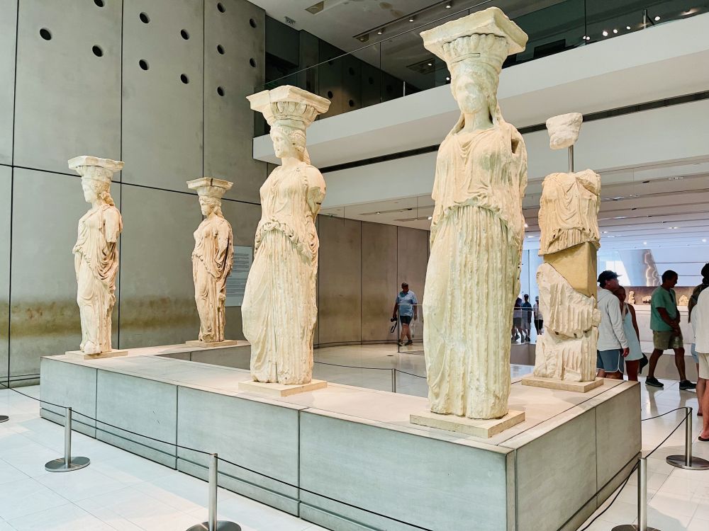 如今卫城山上这里的六位少女立柱已经不是原物了,而是复制品, 有五个原物在卫城博物馆,另一个在大英博物馆。