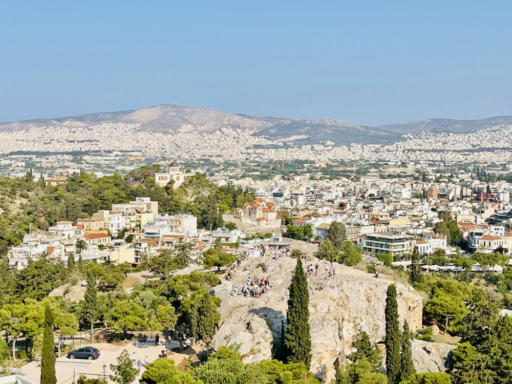 帕特农神庙再往东有座圆形高台 ,那曾经是宙斯的神位,现在成了观赏帕特农神庙的最佳位置,而且还可以四下扫射雅典城貌,永远挤满了人。