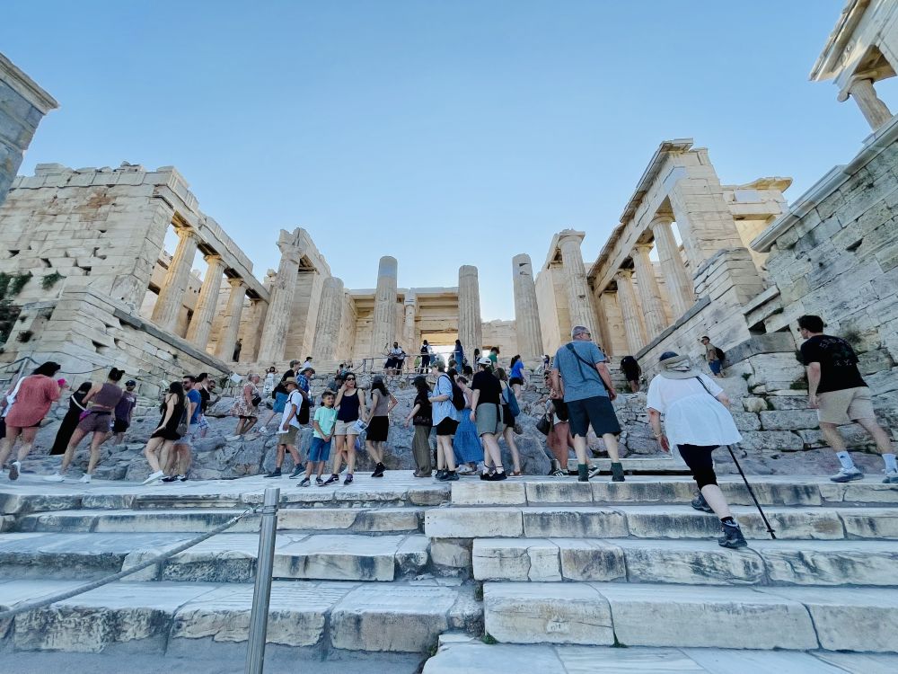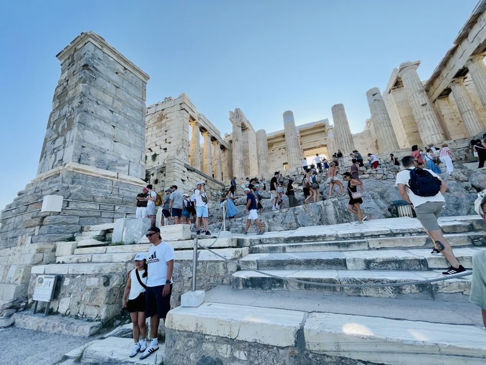 从山门高耸的石柱中穿过,会感到强烈的压迫感和威严感,不由让人产生一种神圣的敬畏,这可能就是当年统治者想给他的臣民传递的信息吧。穿过山门,回望上山的路,整个雅典城都已经踩在脚下了。