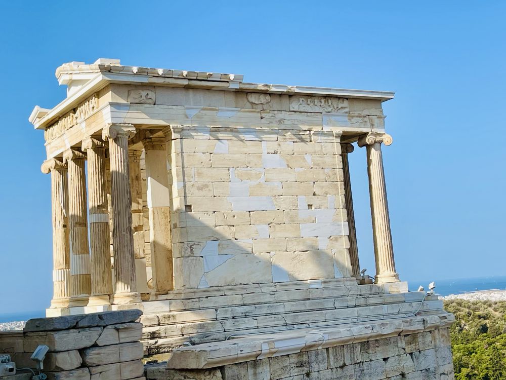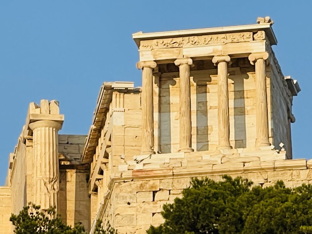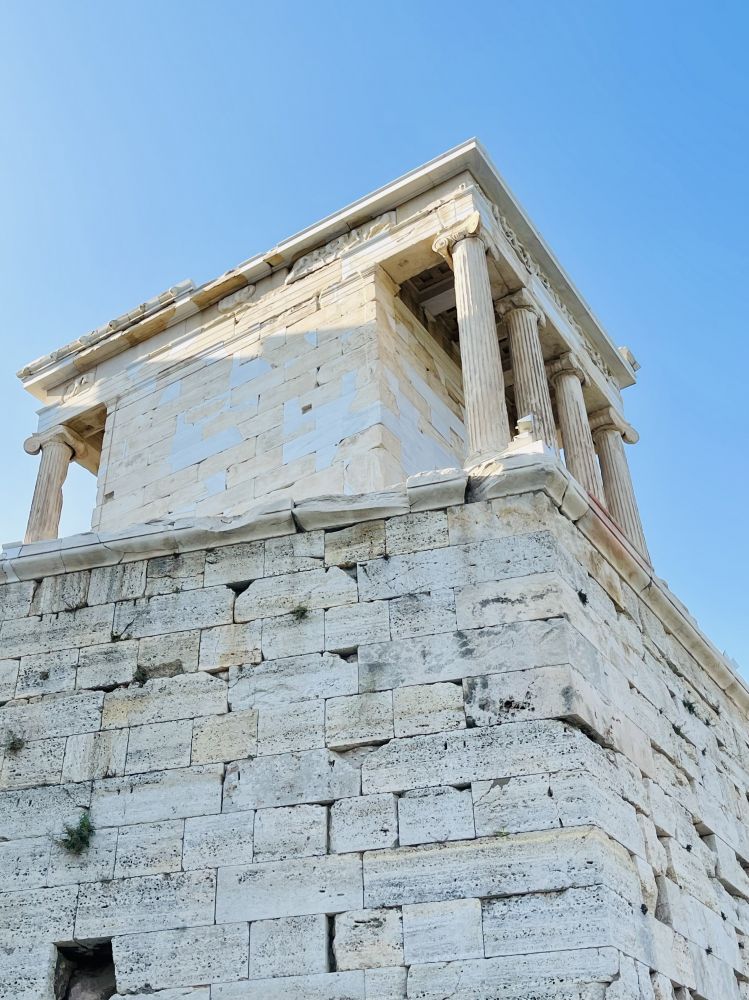 山门右侧高台上有一座不算很大的建筑,这是雅典娜胜利女神庙(Temple of Athena Nike),公元前420年建成。与帕特农神庙相比,这座神庙体积较小,所以建筑形式清晰可见——优美的爱奥尼亚柱、门楣上的浮雕、 还有折射温暖光润的的大理石本身,都让这座建筑充满了难以言喻的美感。