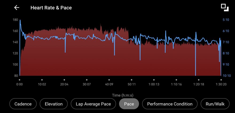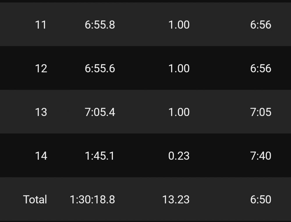 长话短说,今天的半马目标是1小时30分,目标配速6:52。计划是第一英里稍微快一点,第二英里缓一下争取配速稍快于目标配速,后面争取维持这个配速至最后3英里,然后看看能不能再提速。实跑则是差的比较大,第一英里6:28还不错,后面几英里则是稍快了些,不过跑的时候还可以,觉得前面快些也还好,后面掉速也至少还有些余地。总体上也差不多是这样跑的,只是最后一英里掉速有些多。跑得还是很辛苦,尤其是风的影响。虽然跑的路线是点至点的往返路线,往返的时候都感觉是顶风跑的。Garmin记录的半马成绩是1:30:19,但是距离稍远于半马距离的。根据最终6:50的平均配速,这个半马成绩应该1:29:28(Strava),俺觉得算是破了1:30的目标啦。相比2022年底1:35左右的个人最好成绩,也算是幅度比较大的PB了,开心。下面是这次具体数据的分享。