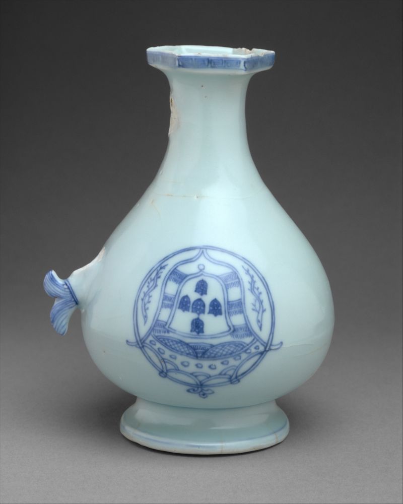 图一的瓷瓶是大都会收藏的年代最早的中国出口欧洲的瓷器。时间是明朝正德年间,约1520年左右。出口地点是葡萄牙,瓷瓶上的花纹是葡萄牙皇家的徽章,而瓶子的式样是伊斯兰的风格。葡萄牙是大航海时期的先驱,我们熟悉的迪亚士、达伽马、麦哲伦都是当时葡萄牙航海家。其中麦哲伦在1522年完成了人类首次环球航行。这件瓷器可以说是当时开启航海和贸易的见证。葡萄牙也是在1557年占领了澳门。