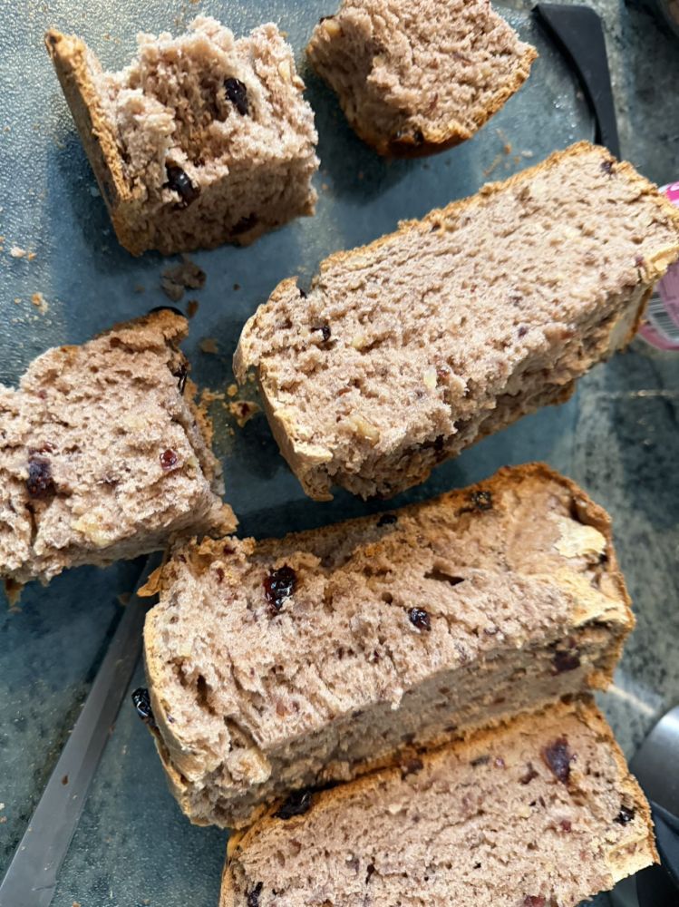 自己烤面包,把核桃和面粉同时放入面包机里,核桃被打的很碎,每一口都吃的很香。