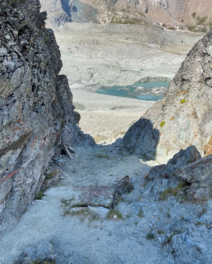 过了湖就开始往山上爬升,翻过一座小山后就是一条沿着山脊的爬升长道,途中又碰到前两天同桌的一对荷兰人,不过这次是那男的老老实实跟在女的后面慢慢走。最后走到山口下面是500尺的几乎垂直的爬升,大概都超过了45度了,特别是最后一段没法站稳,需要拉着铁链往上走,最后到达海拔2919米的Riedmatten山口。这山口就很小一块地方,有二人在那休息,我就在另一边休息了片刻。接下去是一路2800尺的下坡路,一路疾走在二点前赶到Arolla,不过今天天气一直晴朗,没下过一滴雨。