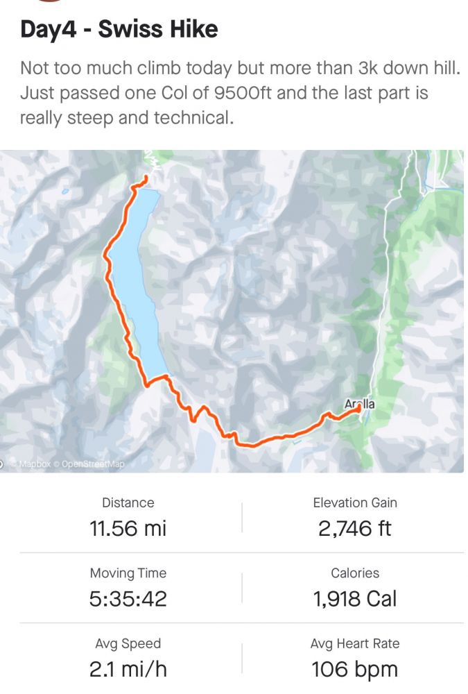 Arolla 这小村庄太小了,路边就几个旅馆,连个便利店都没找到,晚上又是饭店,用google translate 点了鸭子。瑞士的苍蝇太讨厌了,一路走来到处都有,菜还没上就围着我转,这要在其它地方卫生检查肯定通不过,发现瑞士这深山里挺落后的,还好今天跑堂的英语不错。上了菜就一条烤的一般的鸭腿,下面就几片蘑菇,一盘炸土豆条,但没有ketchup, 吃的还不是全饱,没点饮料就花了我近50法郎。