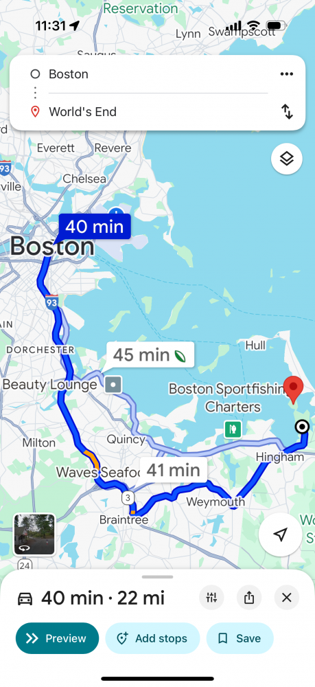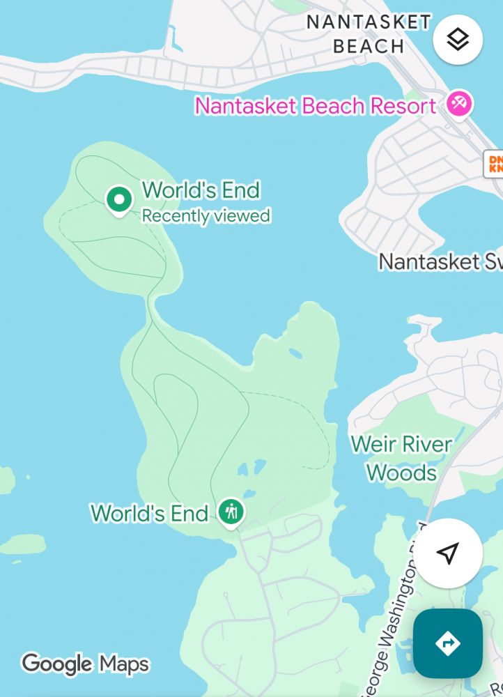 「世界的尽头」(World's End)就是他们托管的保留地之一,位于波士顿南边40分钟车程的一个海滨小镇。为什么这里叫世界的尽头?查不到正式来源,网路传说,这个地方位于小镇半岛的尽头,这个半岛其实是两个小岛组成,涨潮时切断两个小岛的联系,于是成了难以到达的「世界的尽头」。