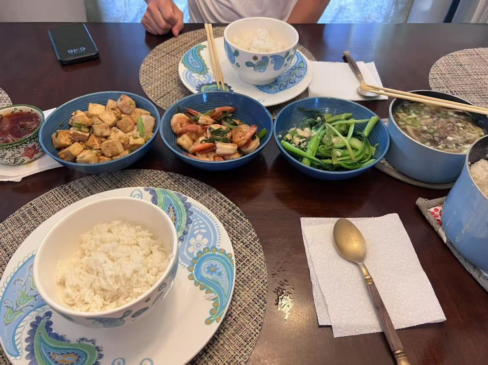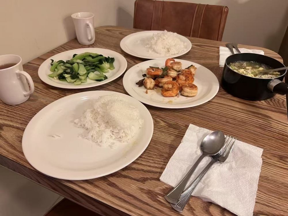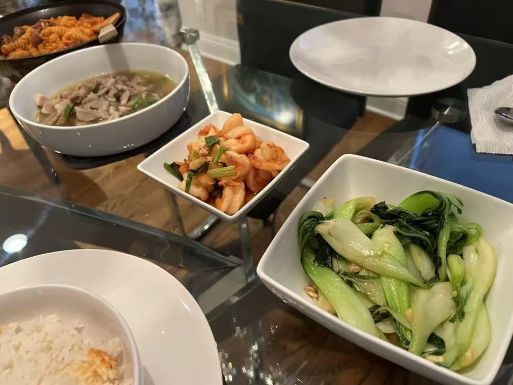 (返程拉斯维加斯,住的是同一家民宿。晚餐。是的。虾和青菜,我的常备。还有一个是蘑菇汤,也是我的标配。米饭我是要吃的,鱼米之乡出来的,不吃米饭,生活不幸福。哈哈。)