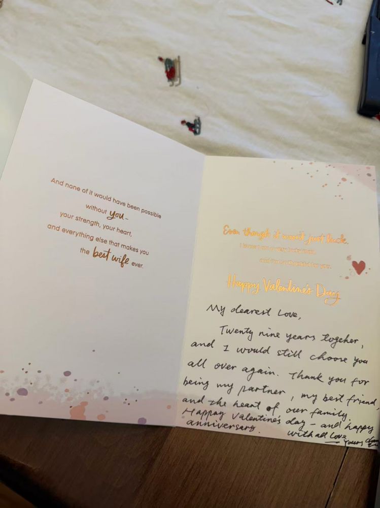 然后,先生写下了,29 年在一起。如果人生再选一遍,我还是会毫不犹豫地选你。谢谢你愿意成为我的伴侣,我最好的朋友,以及,the heart of our family。