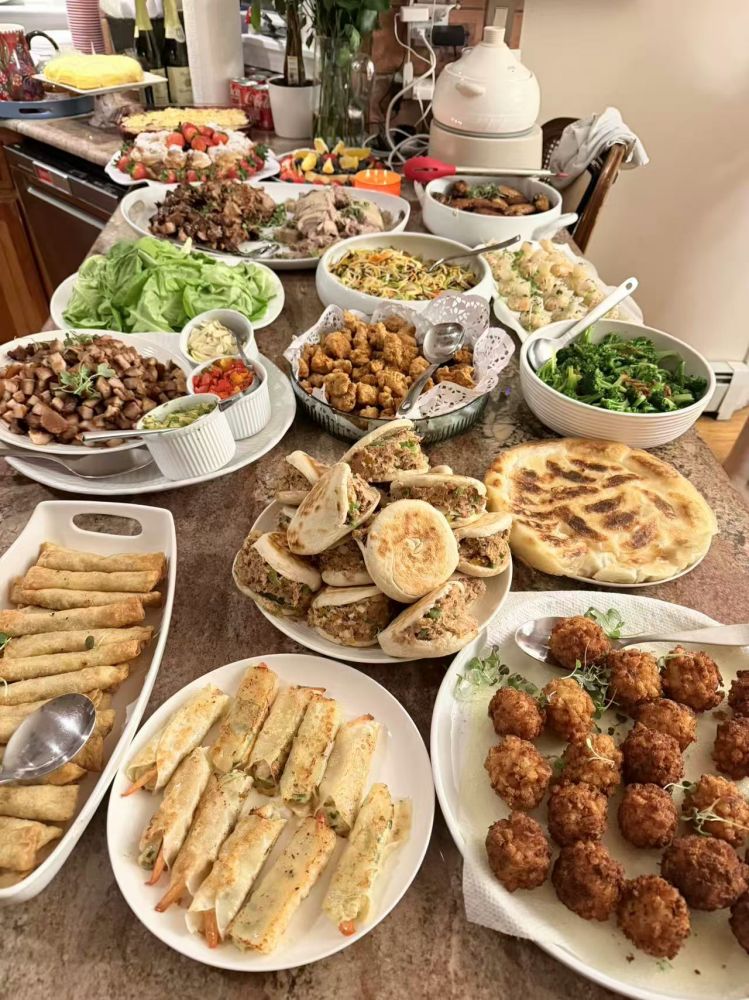 醒了收到朋友的,或感谢或拜年。我说,我要感谢他们。我和先生,异国他乡,能有同学愿意和我们一起庆贺中国新年,给我们热气腾腾的生活感受,我是要感恩的。尤其是,波士顿来的耶鲁前博士A,周日整个一天在给我打小手。P 也是早早来到,帮我处理细致的人工活。还有我的老美好友 V,她的甜点,从来是一流。我叫她,dessert queen。