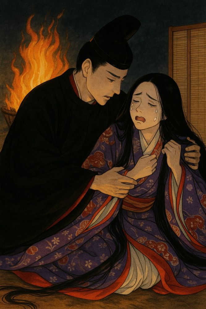 第二十七回“篝火”: 时年36岁的源氏对养女玉鬘发起的情感总攻击。本回“篝火”是由玉鬘屋前庭院点燃的火把而起,寓意源氏内心情欲似火。源氏对玉鬘的感情一直在父女和情人之间摇摆,不过总是遭到婉拒甚至鄙夷。今晚,随着炽烈的篝火,源氏忍无可忍,情欲猛烈燃烧,“胸底情思不断燃”。而更麻烦的是那个不知根底的同父异母的哥哥柏木单相思玉鬘,更是让姑娘惊吓不已。可怜的女子犹如被野狼群包围的温顺小绵羊,发出无助的呼号。