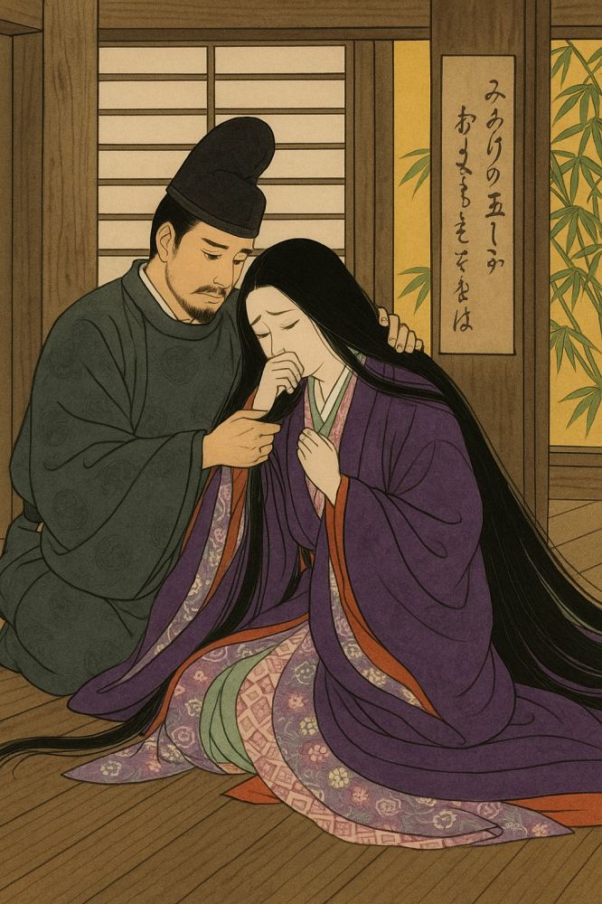 第三十一回“真木柱”:玉鬘当了尚侍而尚未晋谒皇上之前,髭/zī/黑大将与她发生了关系。髭黑大将坚持认为,玉蔓的亲生父亲内大臣已经同意他们的亲事。认亲之前,难在源氏始终不曾松口,当然也没有说明他们二人已经私下成事。此回开篇讲髭黑与玉蔓已同居多时,令人诧异。“真木柱”是髭黑大将十二岁大女儿随亲母离家时留在柱子上的诗句:“临别赠言真木柱,多年相倚莫相忘!”字字泣血,骨肉分离之痛让人落泪。从玉鬘章到此回,共十个章回,合称“玉鬘物语”。