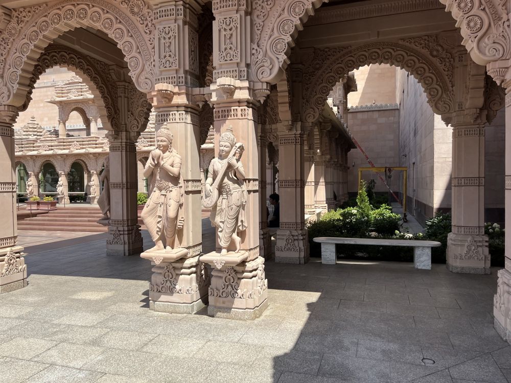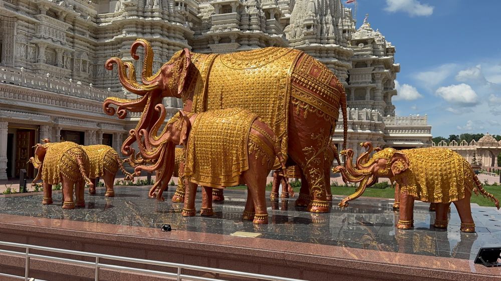 尽管这座雪白的大理石殿堂给人以欧洲教堂的典雅之感,但亚洲寺庙的特色还是比比皆是。主庙前两侧,数头金色大象昂然伫立;入口广场上,一尊少年金身神像讲述着 Nilkanth Varni 的修行故事,神像旁的香案更让人感受到与华人寺庙文化的共鸣。