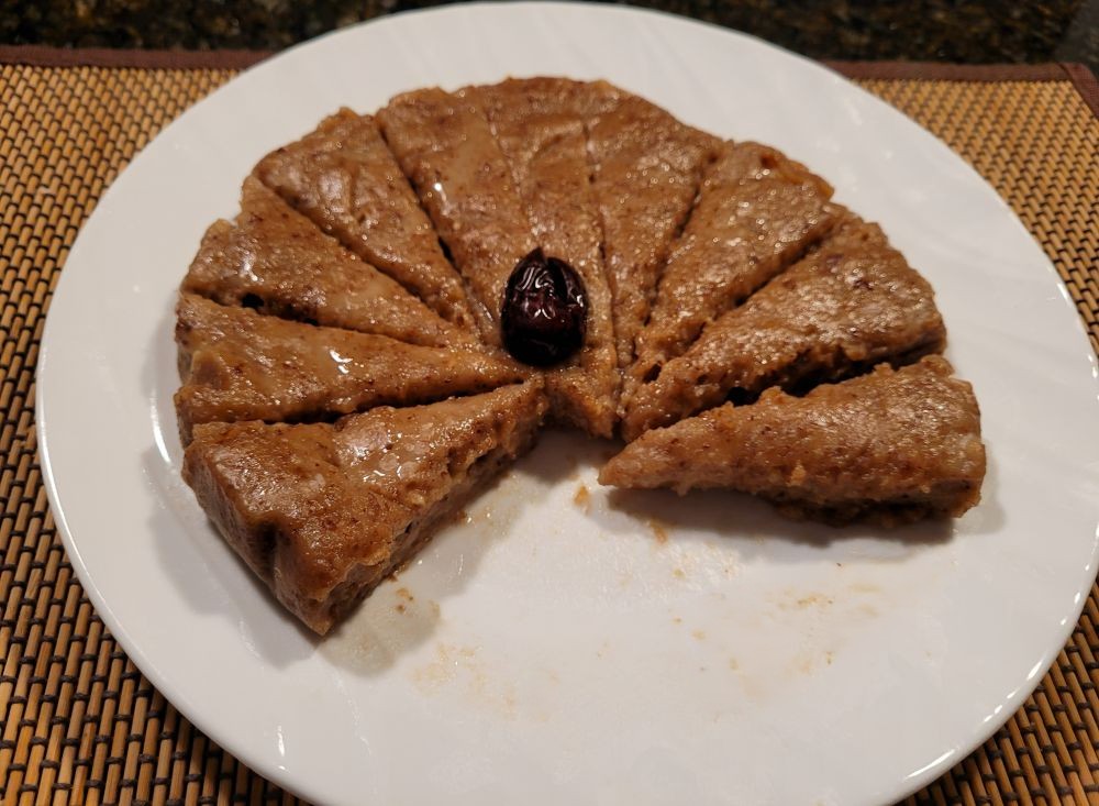 在网上学厨的日子里,我又学会了几款既美貌又美味的年糕做法,每次过年都会做上一两样。材料略多一些,口感的层次也随之倍增,有一款红枣核桃红糖年糕是我吃过最好吃的年糕之一。将红枣去核切成小条,与美国山核桃一同放入搅拌机,加适量清水搅打成糊。再将这份香甜的糊与糯米粉、粘米粉、红糖和油混合均匀,倒入模具,抹平后上锅蒸熟。坚果的醇香与红枣的清甜在口中交织回荡,糯米粉与粘米粉的比例恰到好处,令年糕软中带韧、香甜不腻,真正是唇齿留香。