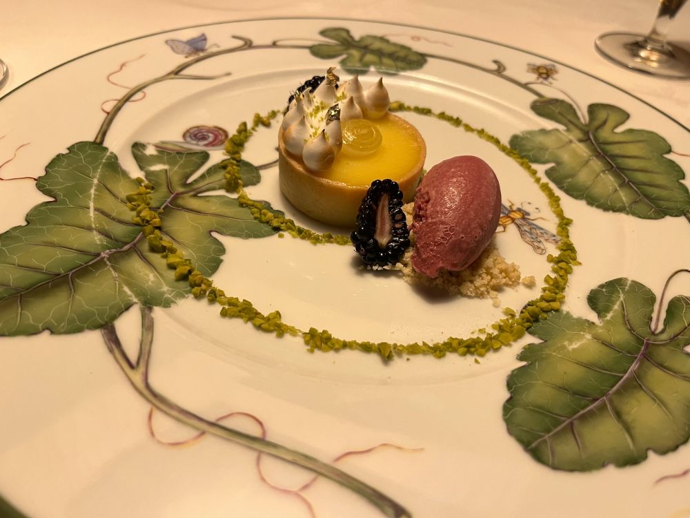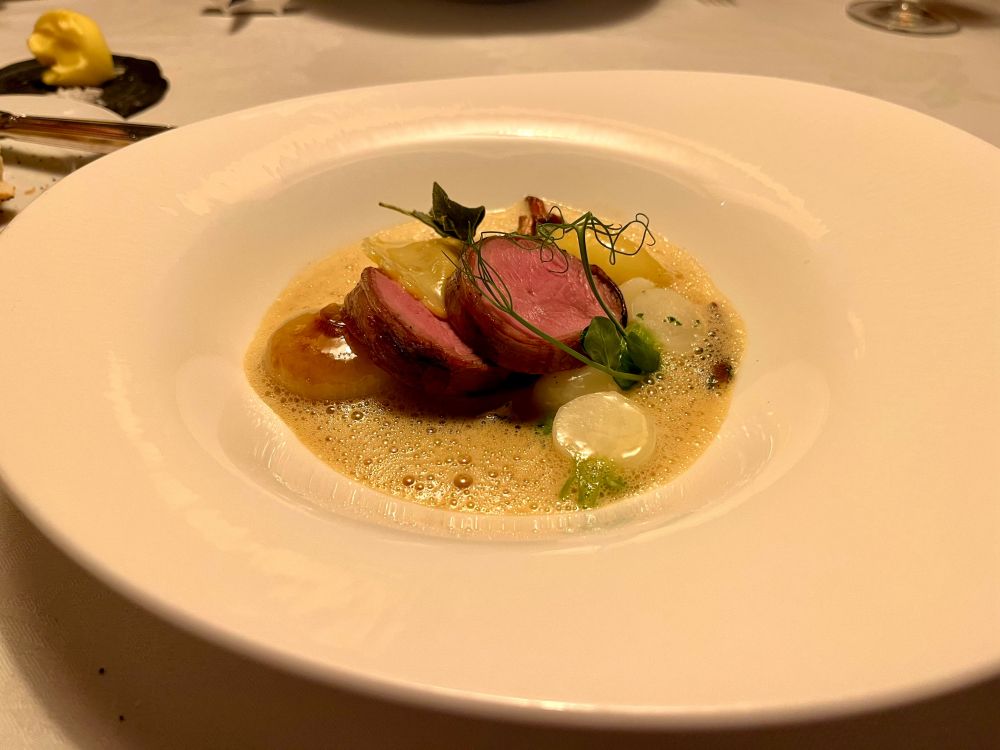 每一道料理都宛若艺术家的杰作,摆盘造型若画,口感层次丰富,质地细腻绝伦。每当一道菜肴结束,侍者便上前撤走碗碟与刀叉,拂去桌面上的微屑,重新摆上晶亮的银器。上菜时,他们会介绍菜式与佐酒的搭配,比如,深海干贝配的是2023年德国顿霍夫酒庄的雷司令白酒;羔羊腰肉则佐以2024年法国菲吉耶酒庄的玫瑰红葡萄酒。每一道菜都值得细细咀嚼,每一种味道都透着厨师的灵思与匠心。