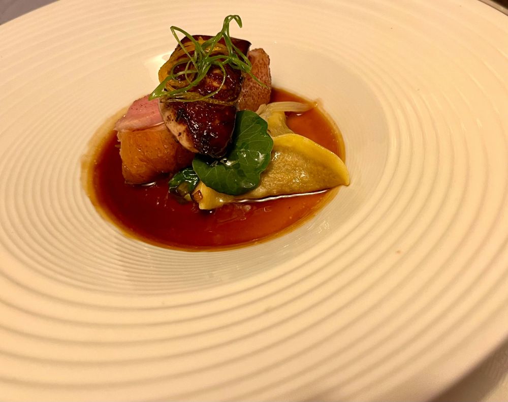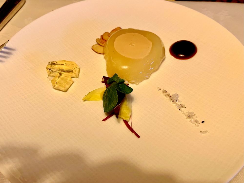 还有香梨包裹的鹅肝慕斯,佐以苏玳酒冻,鹅肝细腻如丝,酒冻在灯下闪着金色的光,甜醇与脂香在口中交织,令人难忘。
